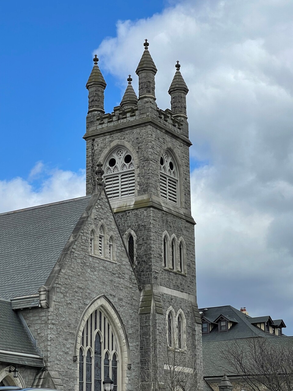 - Repointed 100% of mortar joints at the four corner spires using a raised ribbon profile to match existing masonry.