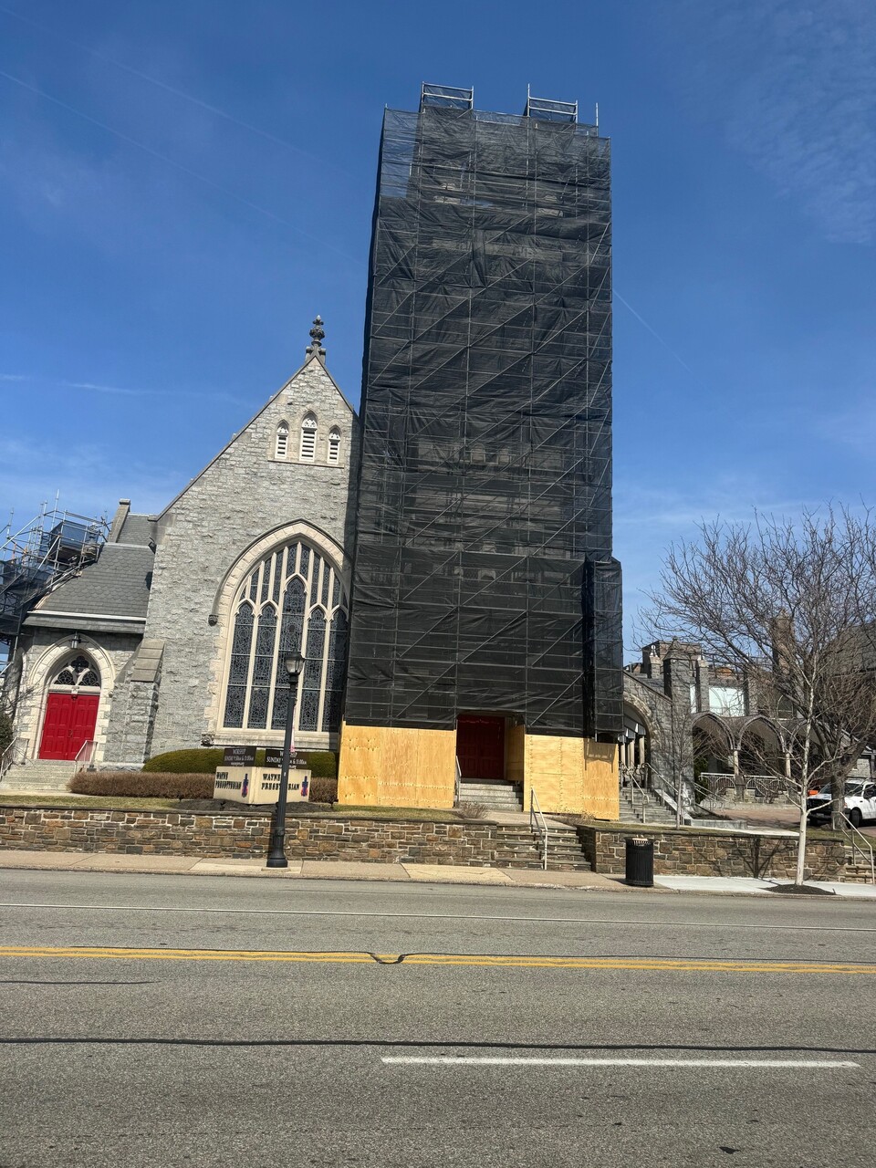 - Installed fixed scaffolding on all four sides of the tower, including access to the spires. Temporary protections were placed over roofing and entrances to ensure safety and uninterrupted church access. Debris netting enclosed the scaffolding for containment.
